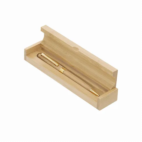 Elegant pen made from a combination of natural bamboo and metallic elements with a golden finish, with a rotating mechanism and blue ink.