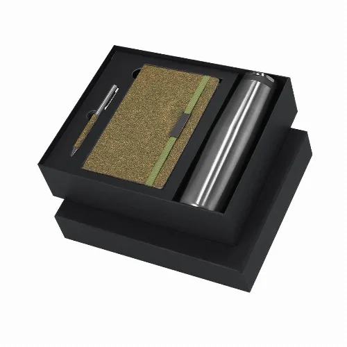 Set of notepad and pen made from Tea Fiber, along with an insulated bottle made from stainless steel.The set includes:- Notepad with hard covers, containing 80 lined pages, elastic band with metal clip, and matching bookmark.- Aluminum ballpoint pen with a chrome finish and Tea Fiber grip, rotary mechanism, and blue ink.