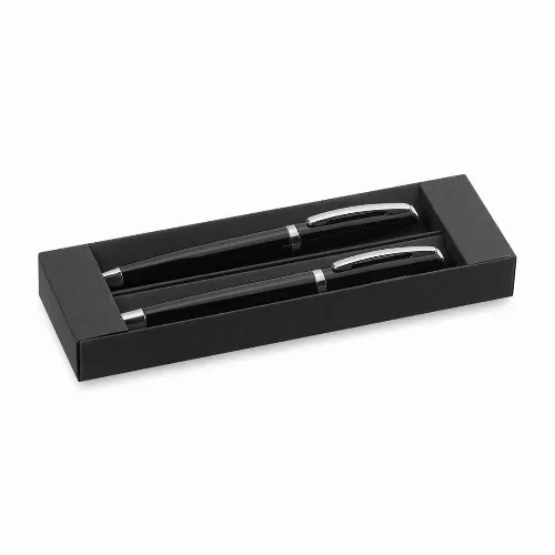 Elegant set of ball pen with twist mechanism and roller with hood in sober design.