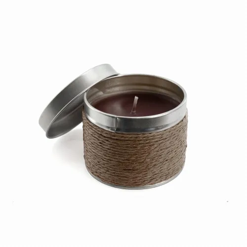 Aromatic candle with metallic container and body covered with thread in a wide range of tones.