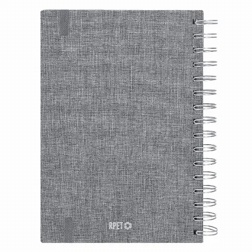A5 size ring diary in soft and resistant RPET, with hard covers and elastic band closure.