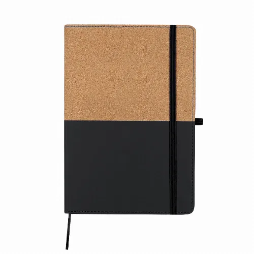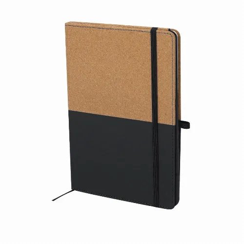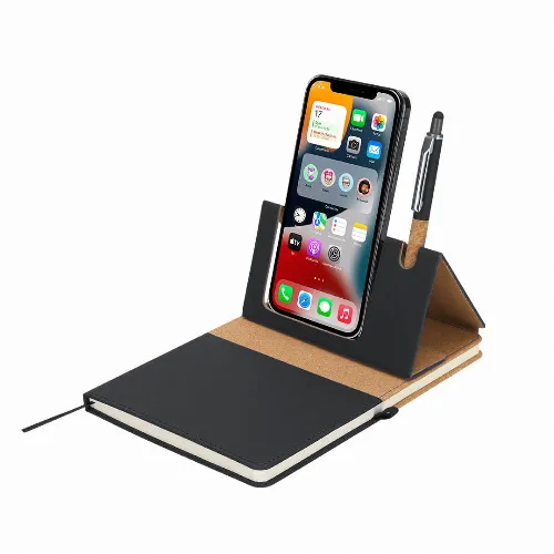 Notebook with rigid covers made from a combination of recycled PU and cork, with a versatile magnetic support in the cork lid for mobile devices.